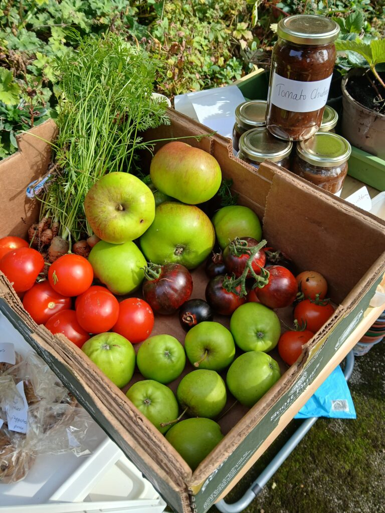 We held our first bring and share stall, with a lovely selection of apples, tomatoes and other garden goodies, as well as chutneys and pickles and a variety of cakes. As always the coffee and cake provided throughout the morning went down very well.