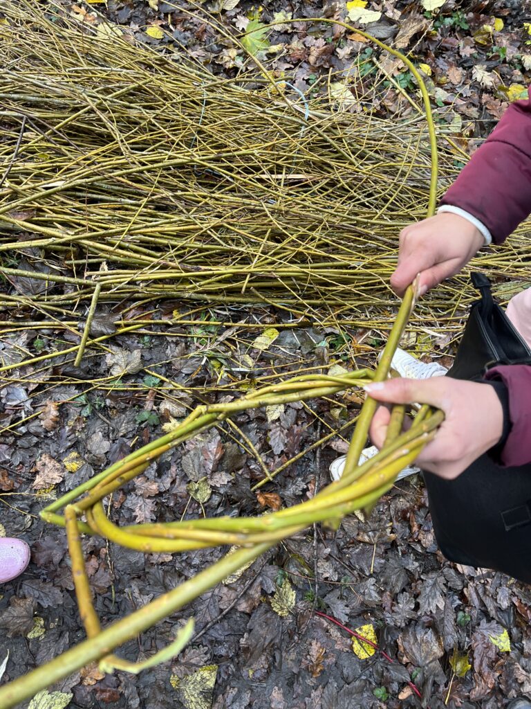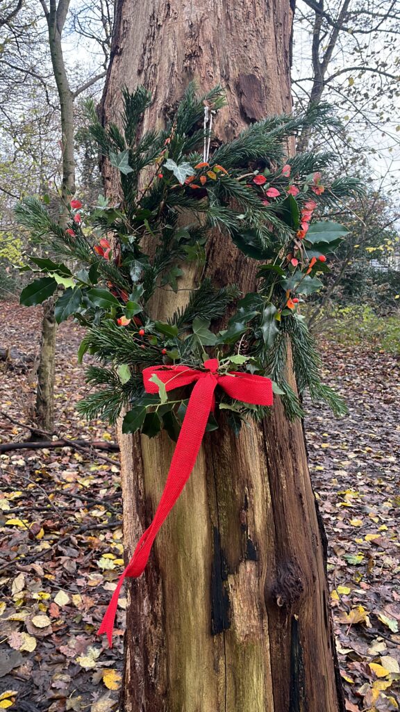 Our LCC Ranger Louise joined us and brought locally cut willow to form the wreath bases. She taught us how to warm, bend and weave the willow, and then we decorated the bases with holly, laurel and dogwood – which had been cut from around the Wood in our Volunteer session running the same morning – and other natural decorations.