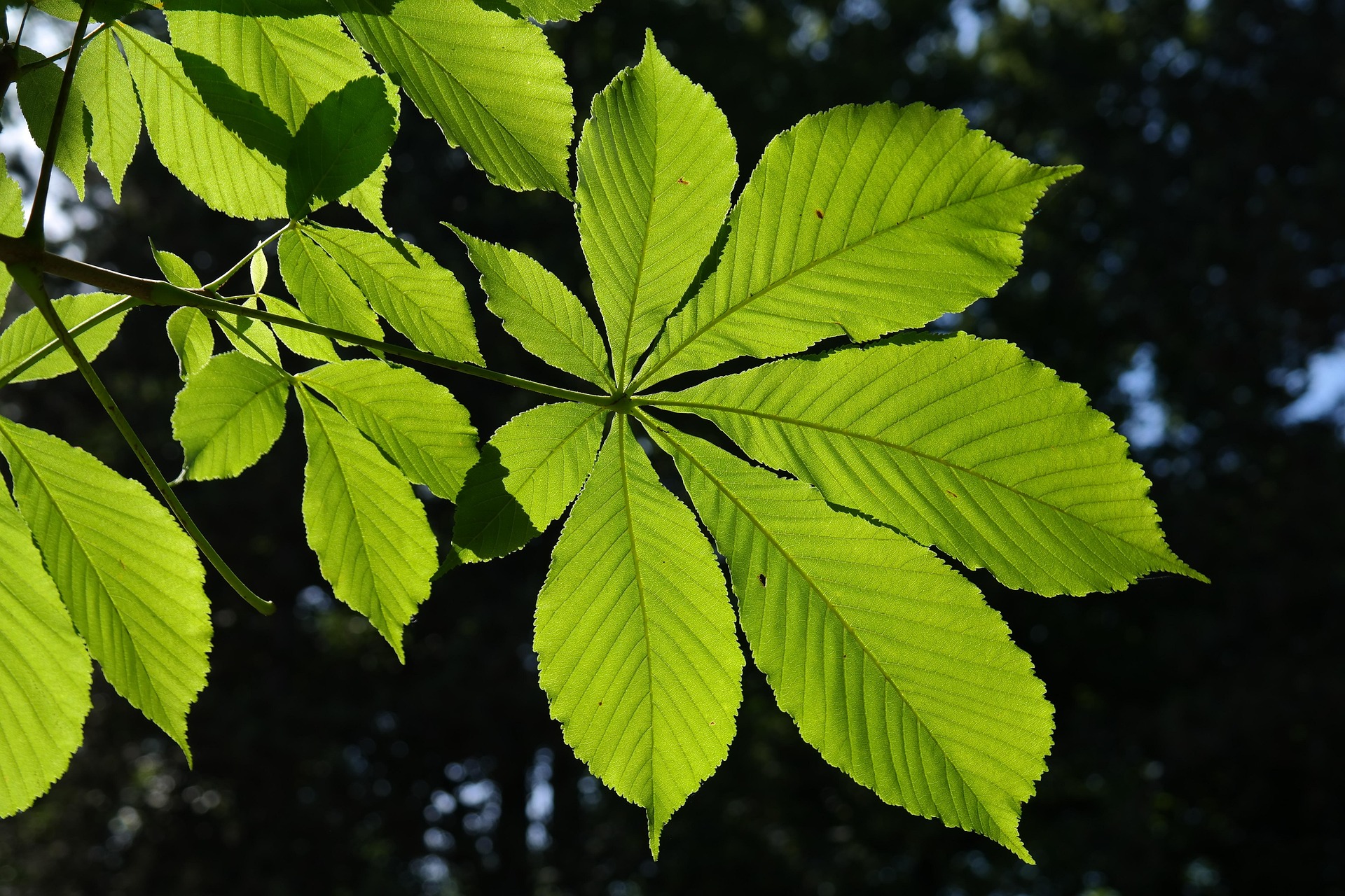 The palmate leaves comprise 5–7 pointed, toothed leaflets spreading from a central stem.
